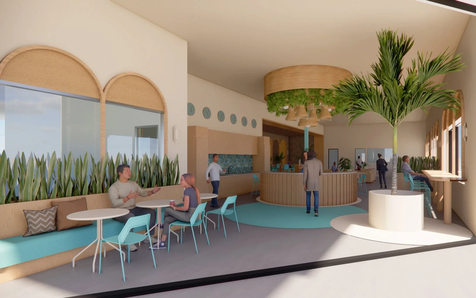 A continuous row of arched windows lines the primary workspace, with bar-height counters and built-in planters. Opposite, a raised platform framed by timber slats functions as an all-hands area or overflow workspace. A large mural and integrated planting give the platform a distinct identity without enclosing it, preserving sight lines across the floor.