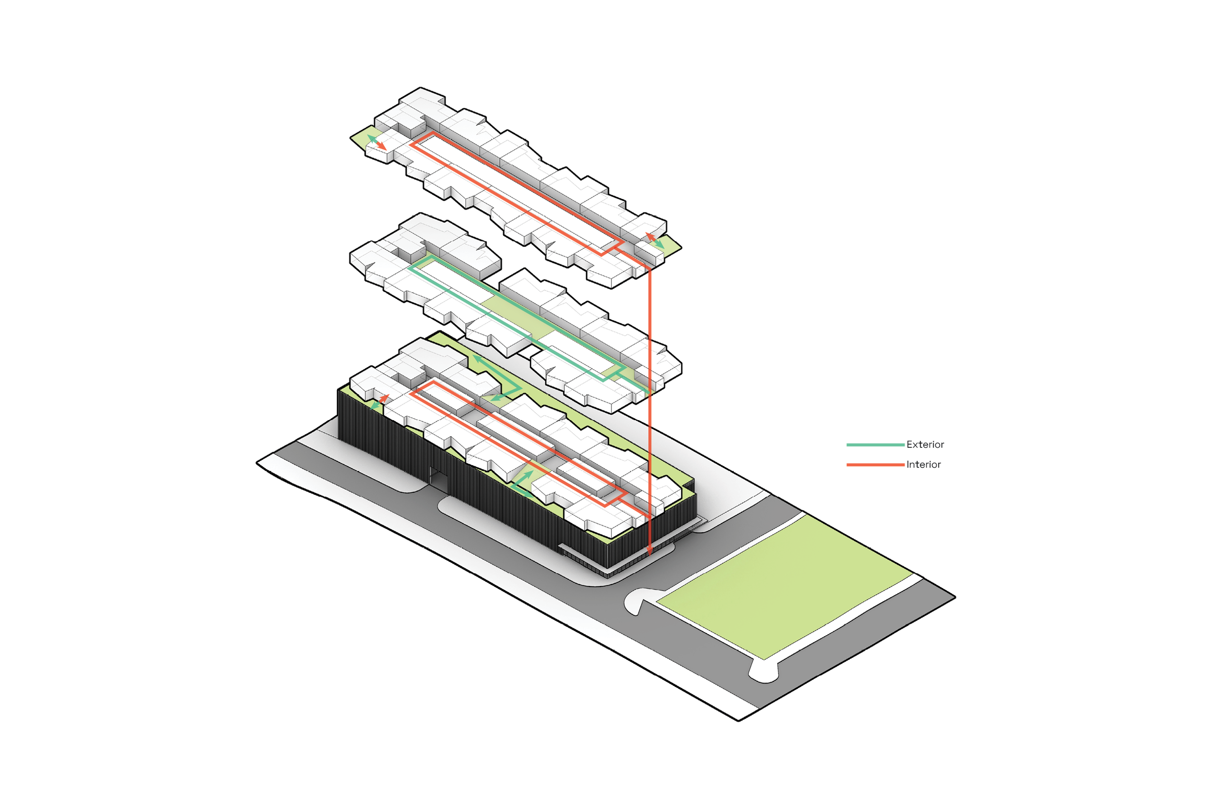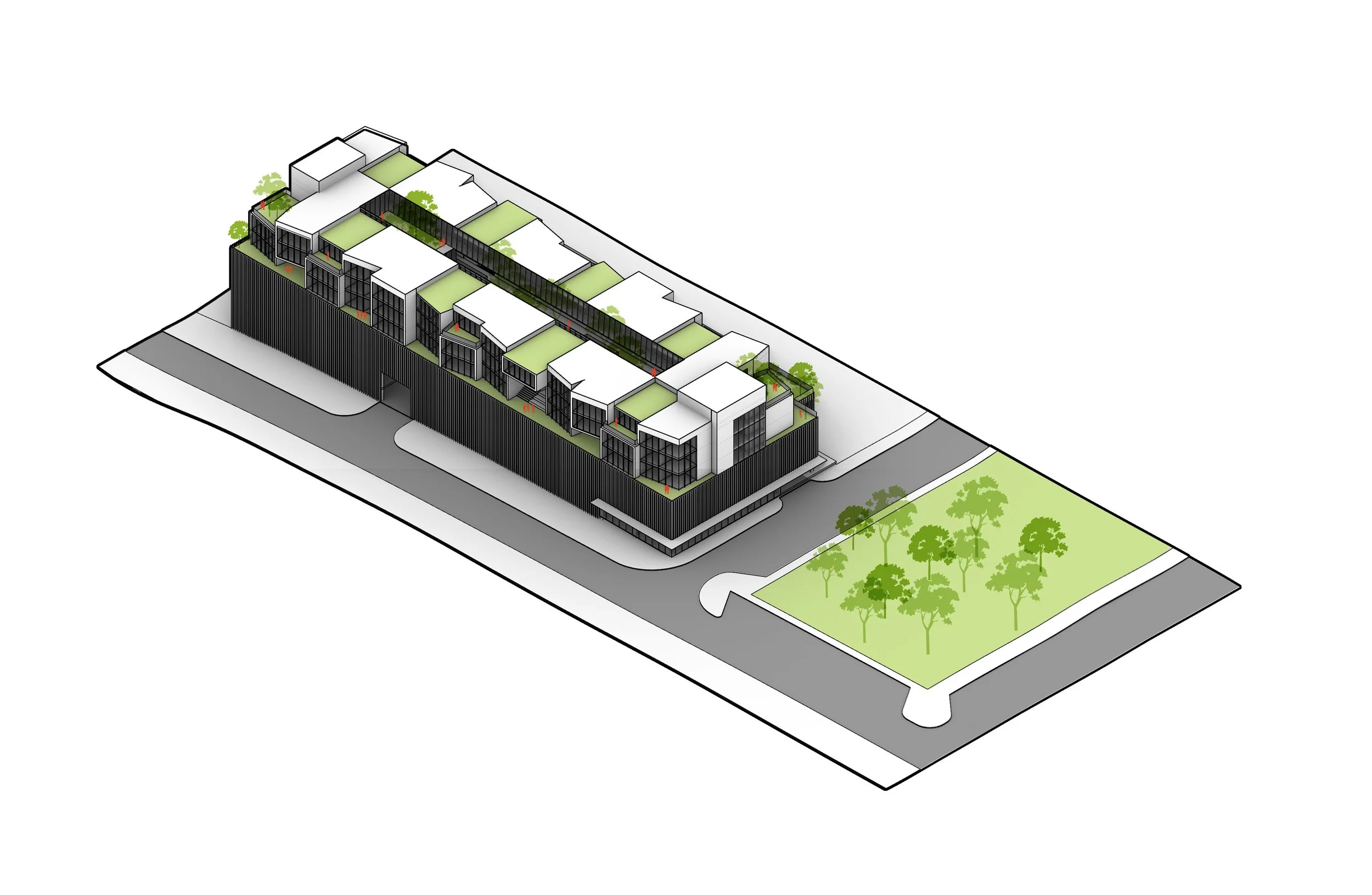 The central organizing feature is a courtyard scheme, which establishes a communal heart for the project. This green core brings natural light deep into residences, promotes cross-ventilation, and fosters interaction through shared outdoor rooms and stoops. Circulation is carefully layered between interior and exterior pathways, creating both intimacy and openness across levels.