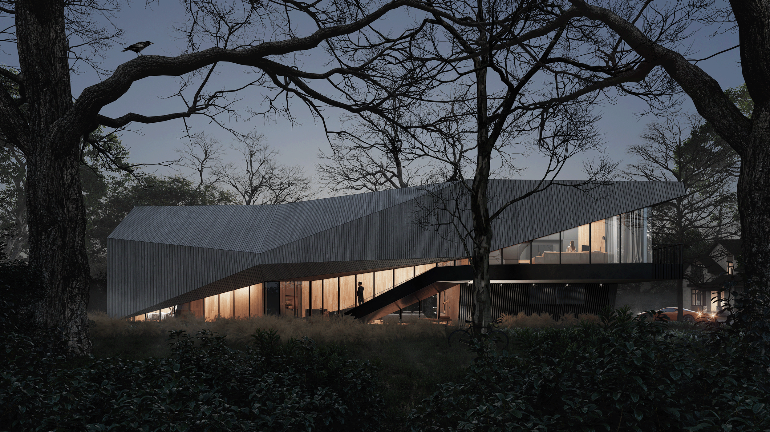 The folded, interlocking rooflines organize the plan into distinct yet interconnected zones. Generous social spaces anchor the ground level, while terraces, gardens, and double-height gathering rooms extend activity outward into the landscape. Angled walls, dramatic overhangs, and shifting volumes create sightlines, courtyards, and circulation paths that encourage movement and engagement between spaces, floors, and users.